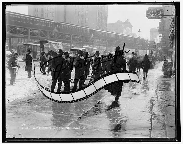Streets,E H Gato's Cigars,buildings,elevated railroads,New York blizzard,NY,1899