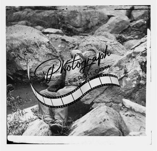 Dead Confederate sharpshooter,foot,Round Top,Gettysburg,Pennsylvania,PA,1863