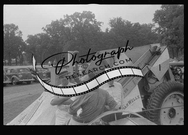 Attendant at farm machine display at county fair,central Ohio,OH,August 1938,1