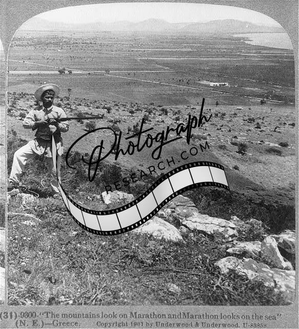 Mountains,Marathon,Sea,Greece,Man w/ gun on hillside,Athenians defeated Persians
