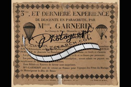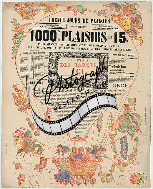 Summary: Broadside announcing an ascension of the giant balloon 'Le Pole Nord' from the Champ-de-Mars, Paris, June 27, 1869. Proceeds from the event, organized by balloonists Wilfrid de Fonvielle and Gaston Tissandier, to support Gustave Lambert's North Pole ballooning expedition. Includes picture of balloons in flight.