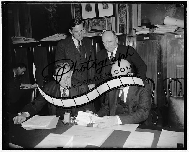 Title: Congratulations! Washington, D.C., May 18. Rep. Charles A. Wolverton of New Jersey, congratulates Senator James J. Davis on his victory in the Pennsylvania primaries for the Republican Senatorial Nomination. Davis defeated G. Mason Owlett. Both Davis and Wolverton are members of the Joint Congressional TVA investigation committee, 5/18/38