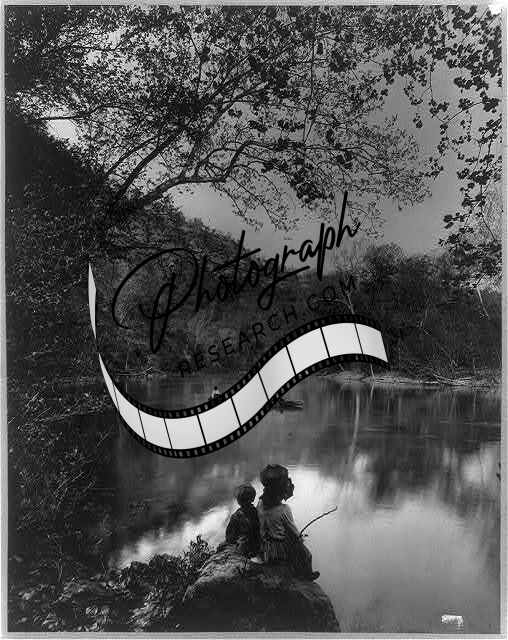 Fishing,children,playing outdoors,boat,trees,food,James River,Virginia,VA,c1908