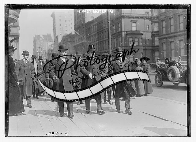 Caruso,Easter,March 23,1913,automobile,walking with men,women,sidewalk