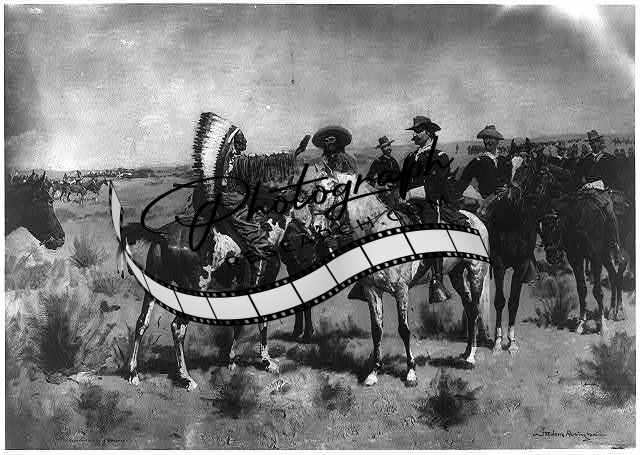 [[The parley. Indian in head dress on horseback talking to group of American sold