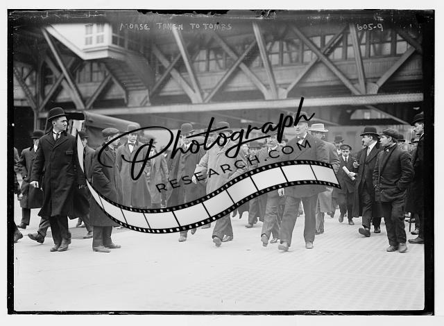 Title: Chas. W. Morse taken handcuffed to the tombs, crowd following, New York