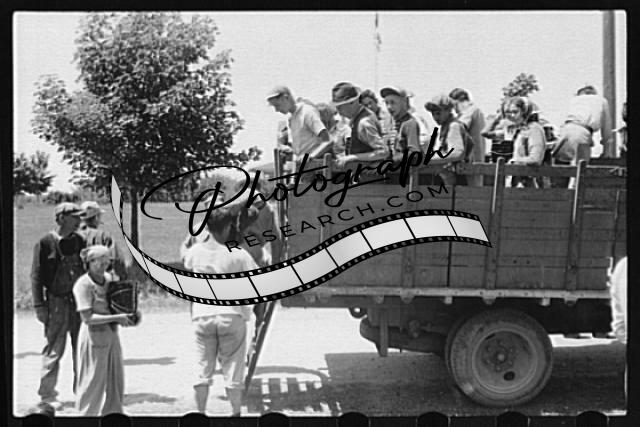 Cherry pickers getting off truck,camp,Door County,Wisconsin,WI,July 1940,FSA