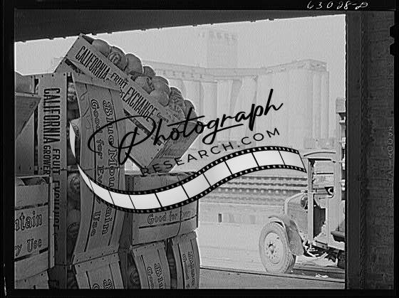 Title: Loading crates of fruit onto truck at fruit terminal. Chicago, Illinois