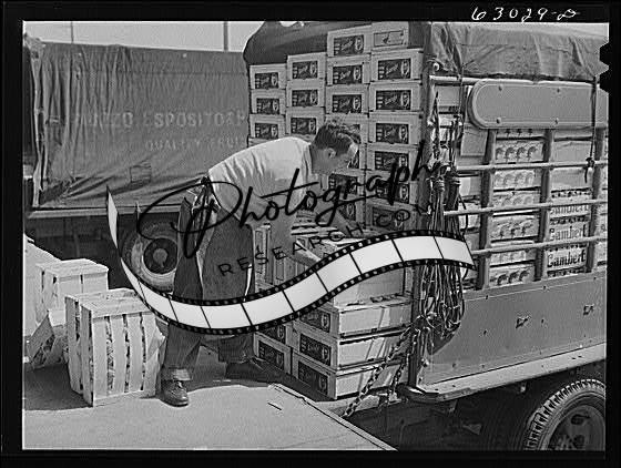 Title: Loading crates of fruits into truck at fruit terminal. Chicago, Illinois