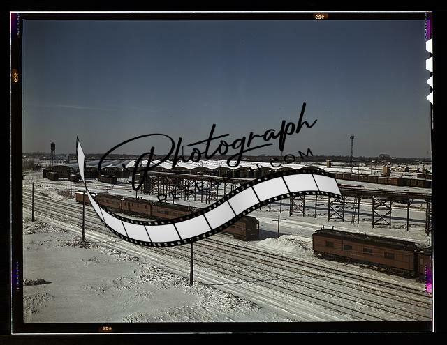 Title: Worker inspecting a locomotive on a pit in the roundhouse at the C & NW RR's Proviso yard, Chicago, Ill.