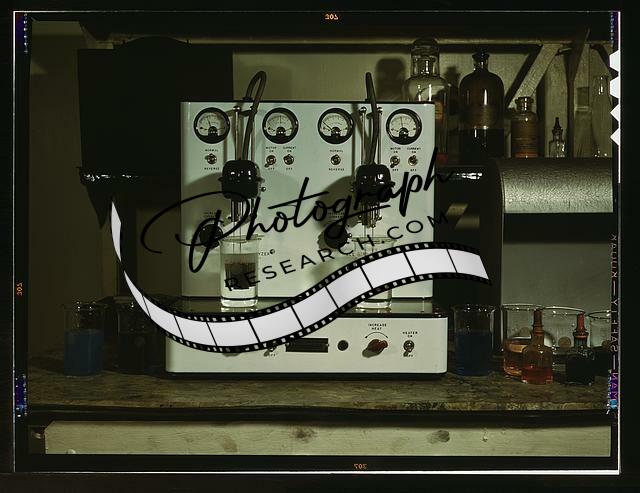 Title: Locomotive lubrication chart in the laboratory of the Chicago and Northwestern Railroad. The laboratory assistant in foreground is working at a precision balance. Chicago, Ill