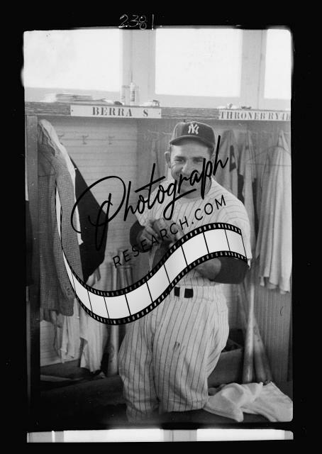New York Yankee baseball player Yogi Berra, three-quarter length portrait, in uniform, in the locker room