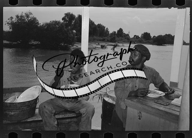 Stevedores eating on stern of boat,Aboard El Rito,Pilottown,Louisiana,LA,FSA
