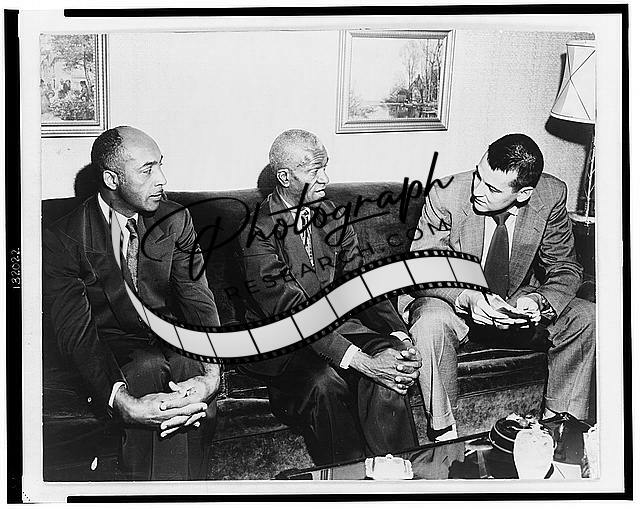 Two unidentified African American men seated on a sofa, talking to a young man, possibly a reporter