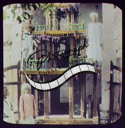 Two men on 2nd tier of 3-tiered shrine,India,1895,William Henry Jackson