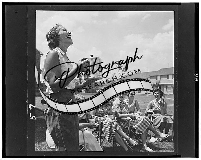 Woman holding coffee pot standing next to group of women neighbors seated in lawn chairs, Park Forest, Illinois