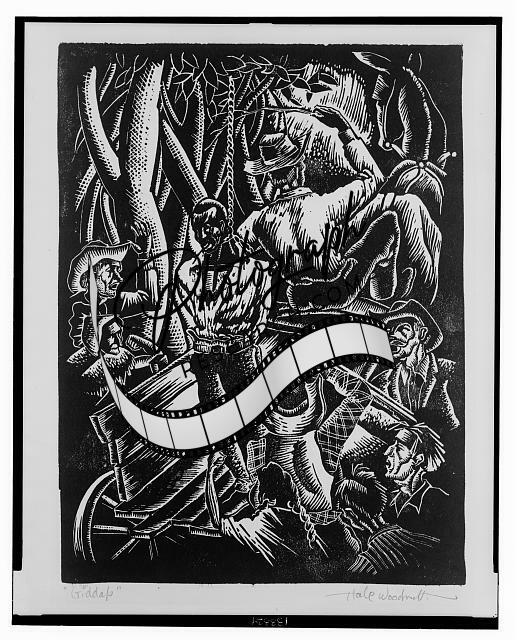 Giddap, Print showing an African American man standing in the bed of a horse-drawn wagon with a noose around his neck. The wagon driver orders the horse to move forward to proceed with the lynching of the man as a group of people looks on.