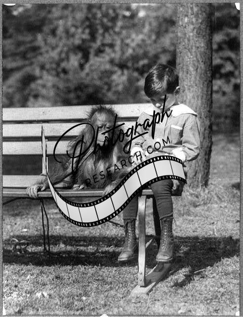 Boy with orangutan on bench,National Zoo,Washington,D.C.,monkey,1909-1932