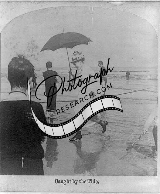 Caught by the Tide,c1890,Well Dressed Woman w/ Umbrella walking on Beach,Bathers