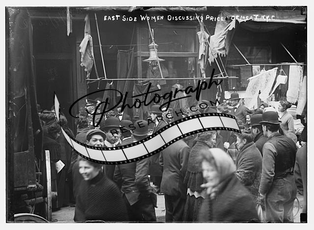 East side crowd discussing price of meat in front of shops,New York,NY,1910