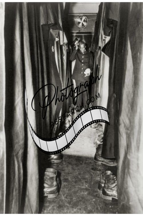 Row of big,brown marching shoe looking up at Pullman porter,1940-1942