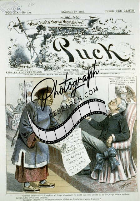 Chinese Minister handing Claims of China to Secretary of State Bayard,Puck,1886