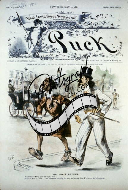On their return,1887,Indian,Red Shirt wearing women's dress,Buffalo Bill,Puck