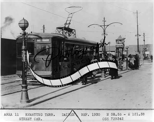 Street car,Darien,Kwangtung Territory,China,before 1930,pedestrians,lamp post