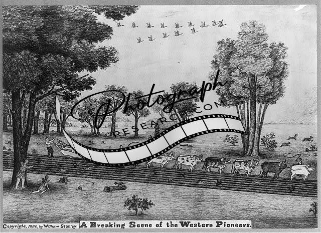 Western Pioneers,men plowing,cattle,log cabin,indians