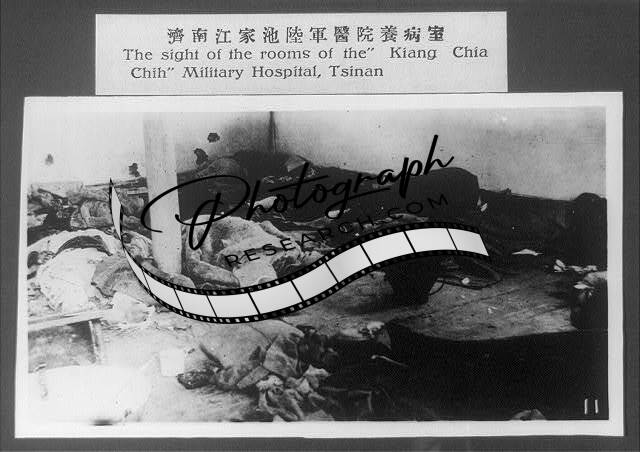 Sight,rooms,Kiang Chia Chih military hospital,dead,casualties,Tsinan,China,1928