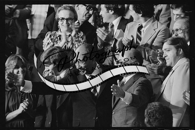 Egyptian President Anwar Sadat and Israeli Prime Minister Menachem Begin acknowledge applause during a Joint Session of Congress in which President Jimmy Carter announced the results of the Camp David Accords