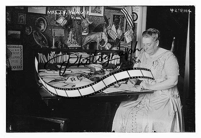 Mrs. J.F. Yawger,seated at desk covered in papers
