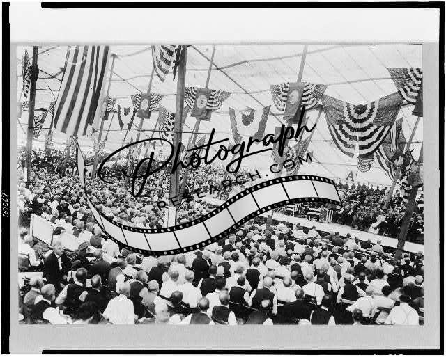 Crowd inside assembly tent,Gettysburg celebration,flags,Pennsylvania,PA,c1913