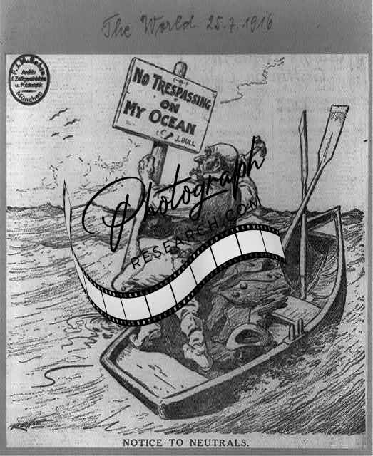 Notice to neutrals,1916,John Bull,rowboat nailing up sign,ocean,No Trespassing