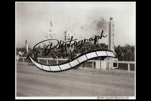 Finish of 1943 Kentucky Derby,horse coming across finishing line,spectators