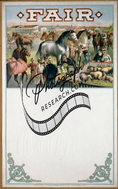 Fair,1891,heads of horses and cows,fair buildings,exhibits in back,photograph