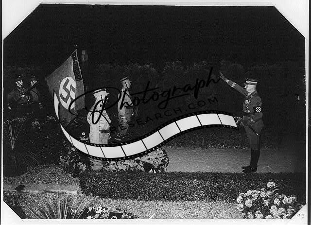 Memorial service at the grave of Horst Wessel; S.A. officer giving Nazi salute to swastika flag over grave. Berlin, 1934?