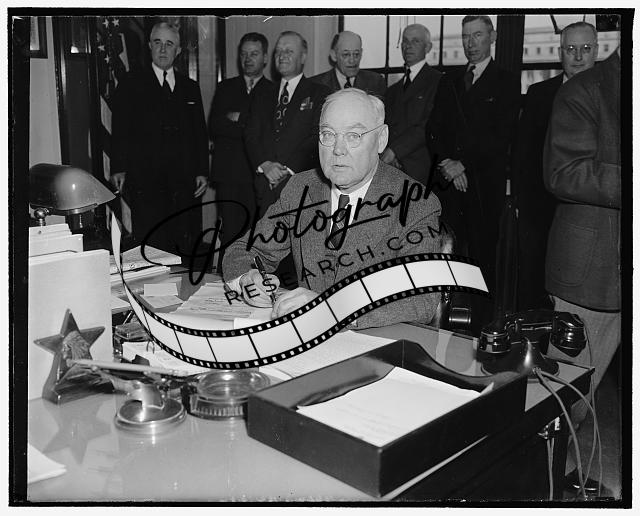 Title: C.I.O. leader endorses recovery program. Washington, D.C., May 2. John L. Lewis, Head of the Committee for Industrial Organization, today told the House Appropriations sub-committee that he was 'wholeheartedly in support' of President Roosevelts program. He urged that arrangements be made to provide jobs for 3,500,000 unemployed. In the photograph, left to right: Rep. Edward T. Taylor, Rep. Clifton Woodrum, and John L. Lewis, 5/2/38