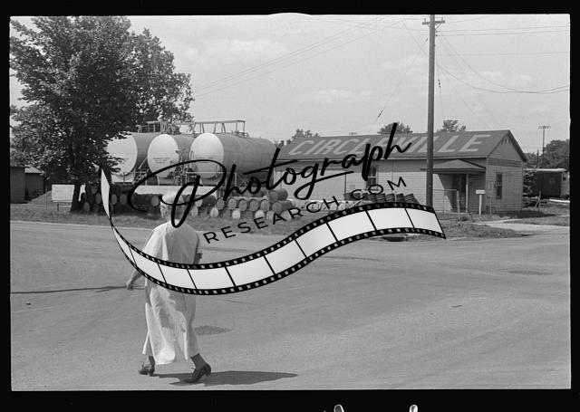 General caption for this series of images: Circleville, county seat of Pickaway County. Average small Ohio city, depending upon surrounding rich farmlands for its livelihood. Because of its non-industrial surroundings, retains much of old-time flavor. Outstanding industries: Eshelman's Feed Mill. Employs 150-200 men the year 'round. Pay averages about eighty-five cents an hour. Container Corporation of America makes paper out of straw, can absorb by-product of all neighboring farms. In addition, a number of canneries and feed mills. During depression many farms of the district were foreclosed. People who lost homes naturally gravitated toward the town. A town of its character is unable to house new influx of population. Consequently there sprang up around it an extensive Hooverville. Circleville got its name through having been built in a circle as a better protection against the Indians. For further information Chamber of Commerce, Circleville. Circleville is the home of Ted Lewis.