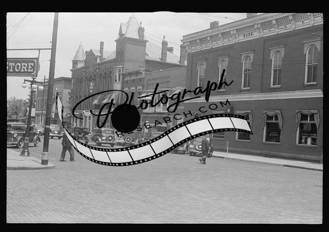 General caption for this series of images: Circleville, county seat of Pickaway County. Average small Ohio city, depending upon surrounding rich farmlands for its livelihood. Because of its non-industrial surroundings, retains much of old-time flavor. Outstanding industries: Eshelman's Feed Mill. Employs 150-200 men the year 'round. Pay averages about eighty-five cents an hour. Container Corporation of America makes paper out of straw, can absorb by-product of all neighboring farms. In addition, a number of canneries and feed mills. During depression many farms of the district were foreclosed. People who lost homes naturally gravitated toward the town. A town of its character is unable to house new influx of population. Consequently there sprang up around it an extensive Hooverville. Circleville got its name through having been built in a circle as a better protection against the Indians. For further information Chamber of Commerce, Circleville. Circleville is the home of Ted Lewis.
