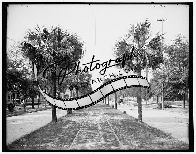 Main Street,tracks,palm trees,roads,Jacksonville,FL,Detroit Publishing Co,c1903