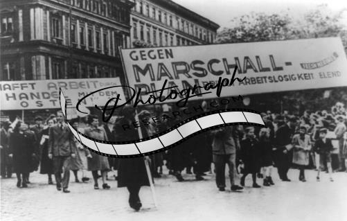 People,sign 'Gegen Marschall-Plan Bringt Arbeitslosigkeit Elend,Berlin?,c1952