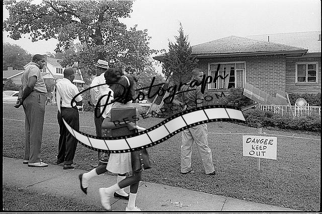 Summary: Photograph shows a crowd of African Americans behind a storm fence with police carrying a woman on the other side.