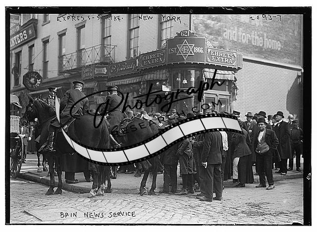 Express strike,New York,NY,Ehrets Extra,men on horseback,crowd of people,Bain