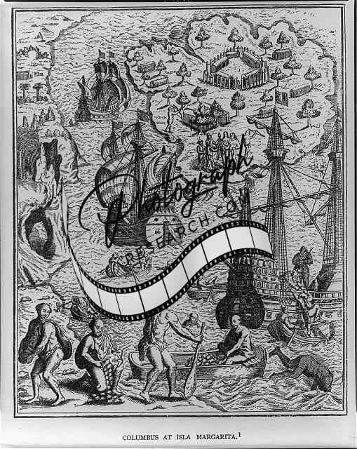 Columbus at Isla Margarita,Indians,oysters,c1600s
