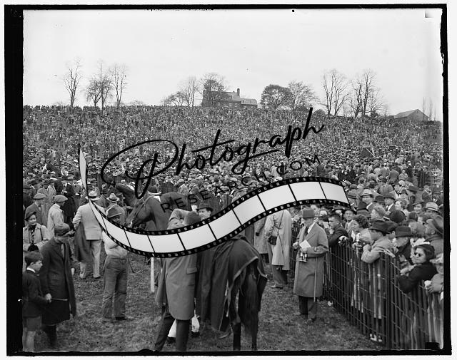Attended,Maryland Hunt steeplechase race,horses,crowd,fence,Baltimore,1937