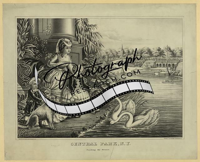 Feeding the Swans,Central Park,New York,NY,1873,Woman,Children,Dog,Pond