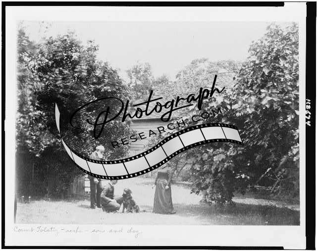Count Leo Tolstoy, wife, son, and dog, 1870's