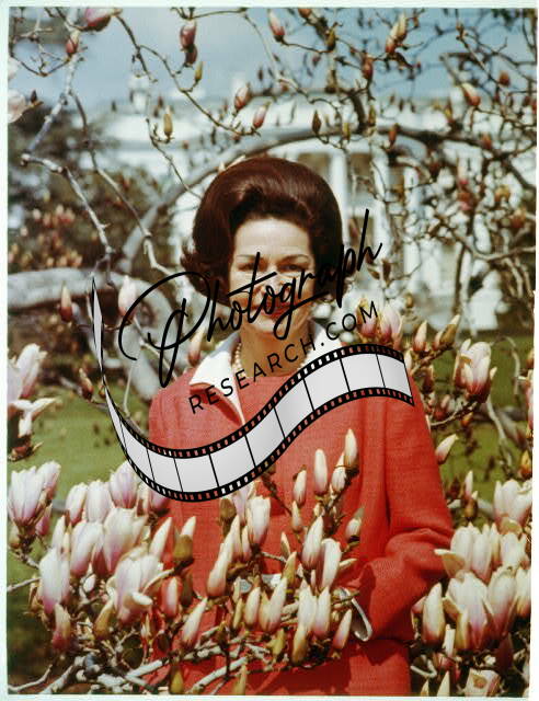 Lady Bird Johnson standing amid tulip tree blossoms behind White House - head and shoulders, facing front