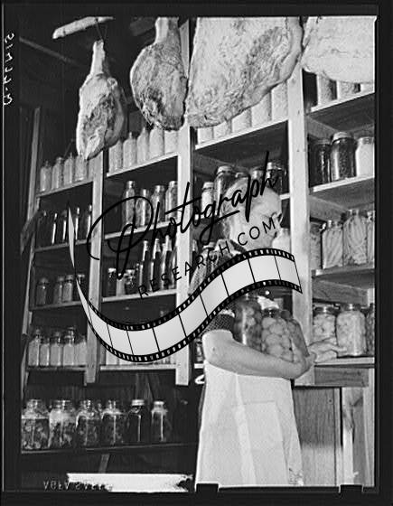 Title: Mrs. Peacock and daughter Mary, RR (Rural Rehabilitation) four years, getting some of their supply of canned foods for dinner. Many families keep their jars on shelves along wall in bedroom and living room. Coffee County, Alabama